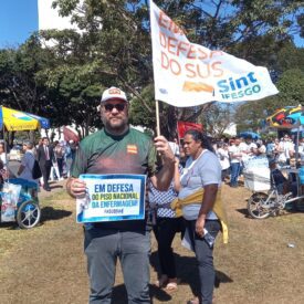 No dia 28 de junho do ano de 2023, o Sint-IFESGO, profissionais da saúde e demais sindicatos foram em caravana para Brasília pelo pagamento do piso salarial da enfermagem. A mobilização e ato tem por finalidade pressionar o Governo Federal a implementar o piso da enfermagem e cobrar do STF que retire os questionamentos e permita o pagamento do piso da categoria que há anos seguem na luta pela valorização e reconhecimento da categoria. Representando o Sint-IFESGO, estiveram presentes, o coordenador geral, Fernando Mota, e os dirigentes sindicais, João Pires Jr e Eduardo Marques, Rosilene Alves. -